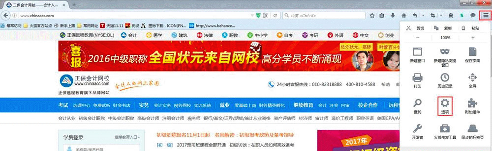 如果遇(yu)到了(le)無法加載flash的情況(kuang),首(shou)先我們(men)在(zai)瀏覽(lan)器右上角的“功具(ju)”中(zhong)打開(kai)“選(xuan)項(xiang)”。