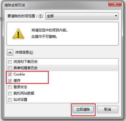 勾選(xuan)Cookie、緩存,點(dian)擊(ji)“立(li)即清(qing)除”。
