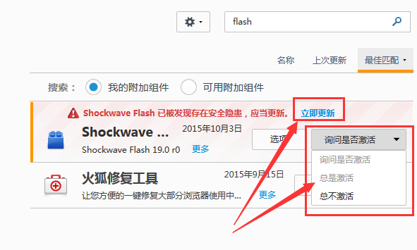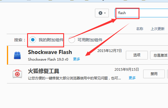 在附加組件(jian)查詢頁(ye)面中,選擇(ze)我的附加組件(jian),找到flash插(cha)件(jian),如(ru)果插(cha)件(jian)很多可以通過搜(sou)索的方(fang)式搜(sou)索到。在搜(sou)索框中輸入flash關鍵字查詢flash插(cha)件(jian)。
