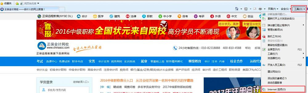 點擊(ji)瀏(liu)覽(lan)器(qi)右上(shang)角(jiao)的工具按鈕,選(xuan)擇“Internet 選(xuan)項”。