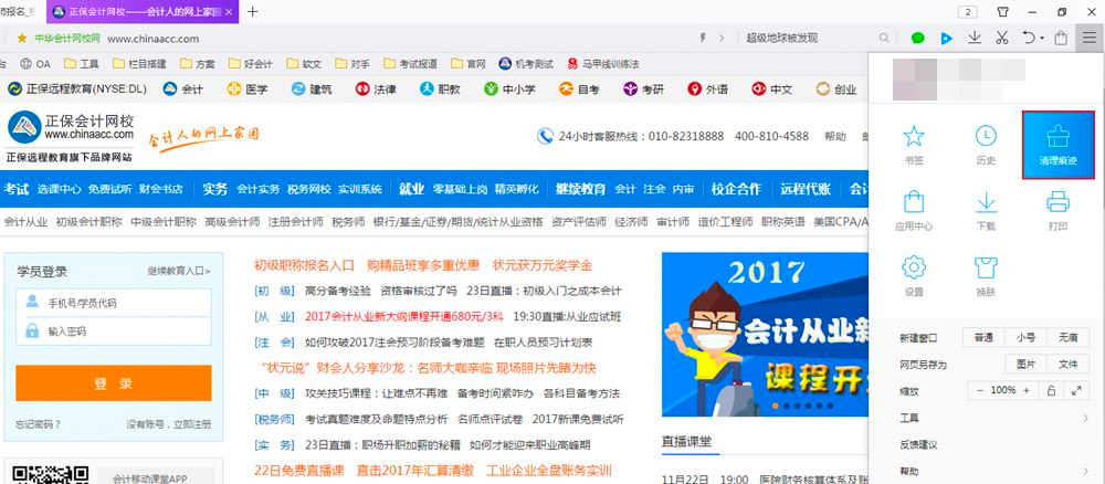 點擊瀏覽器右上角(jiao)的設置(zhi)按鈕,選擇“清理痕跡”。