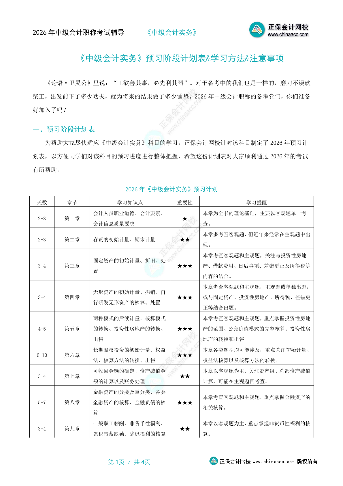 2026年《中級會計實務》預習階段計劃表_學習方法_注意事項
