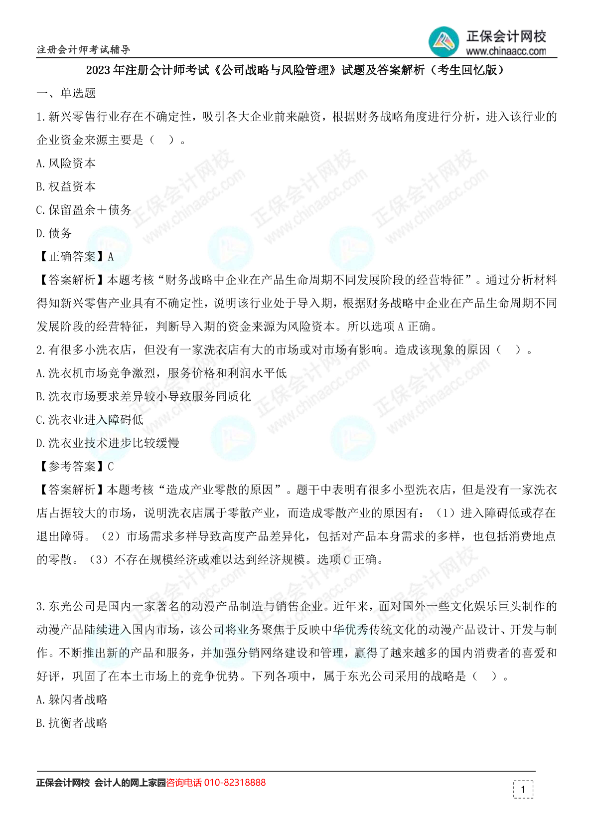 2023年注冊會計師考試《公司戰略與風險管理》試題及答案解析(考生回憶版)